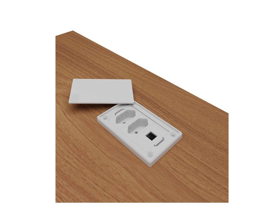 A caixa de conectividade integrada facilita o acesso a tomadas e organização de cabos, mantendo o espaço sempre limpo e funcional, com todos os dispositivos conectados com praticidade. O puxador metálico nas portas do balcão acoplado acrescenta um toque de sofisticação e modernidade, elevando o padrão estético do ambiente.
